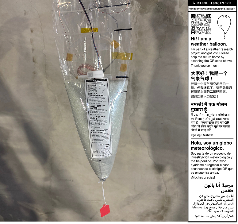“Hi! I am a weather balloon. I’m part of a weather research project and got lost. Please help me return home by scanning the QR code above. Thank you so much!”